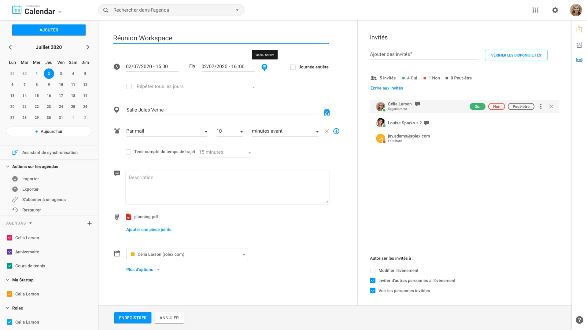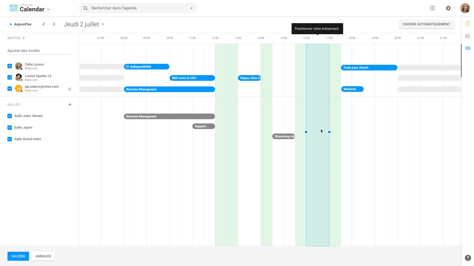 La problématique se pose dans toute entreprise : comment organiser une réunion avec plusieurs personnes quand celles-ci sont régulièrement occupées ? Ce nouvel outil permet d’afficher l’agenda des personnes invitées et de trouver rapidement une disponibilité.