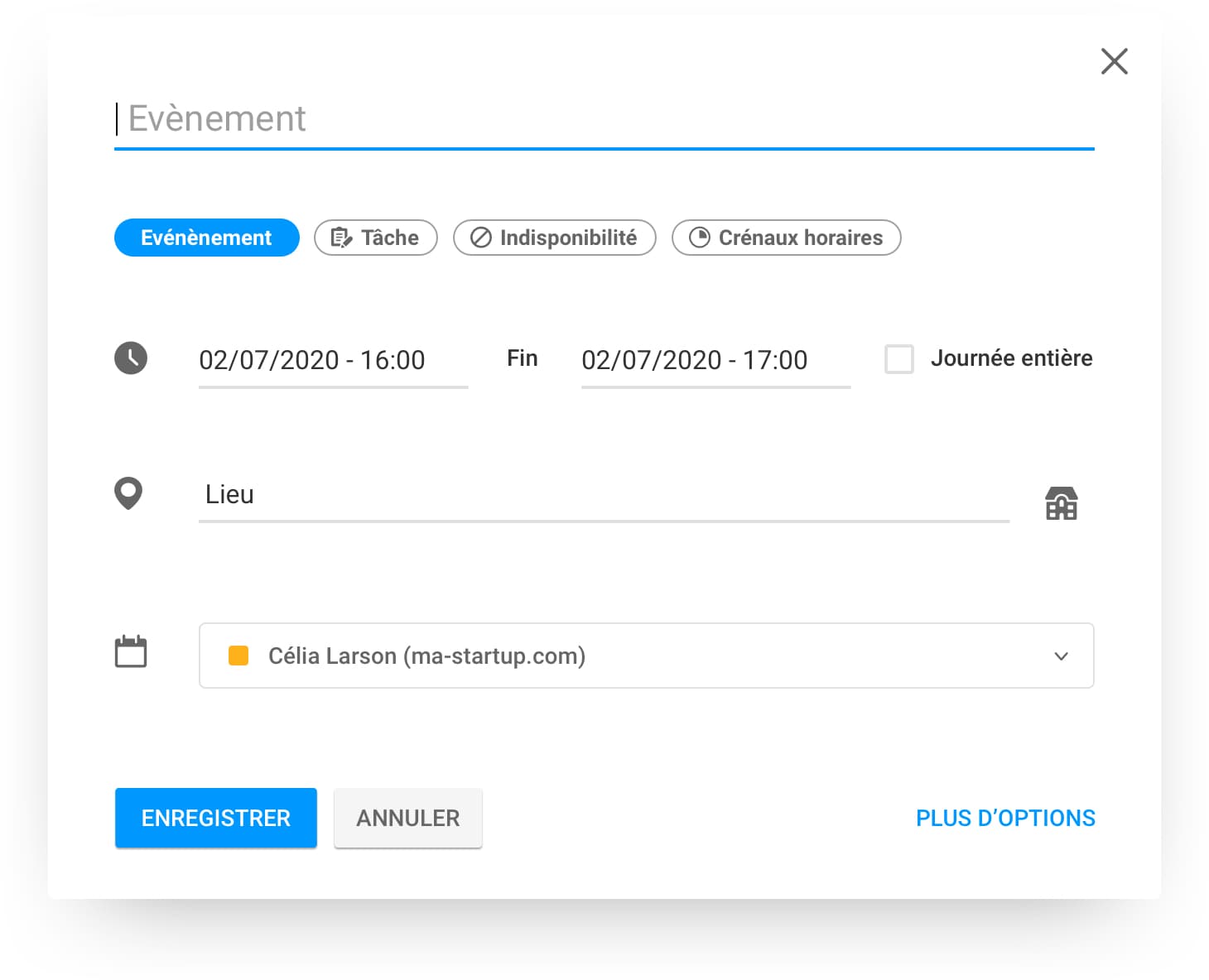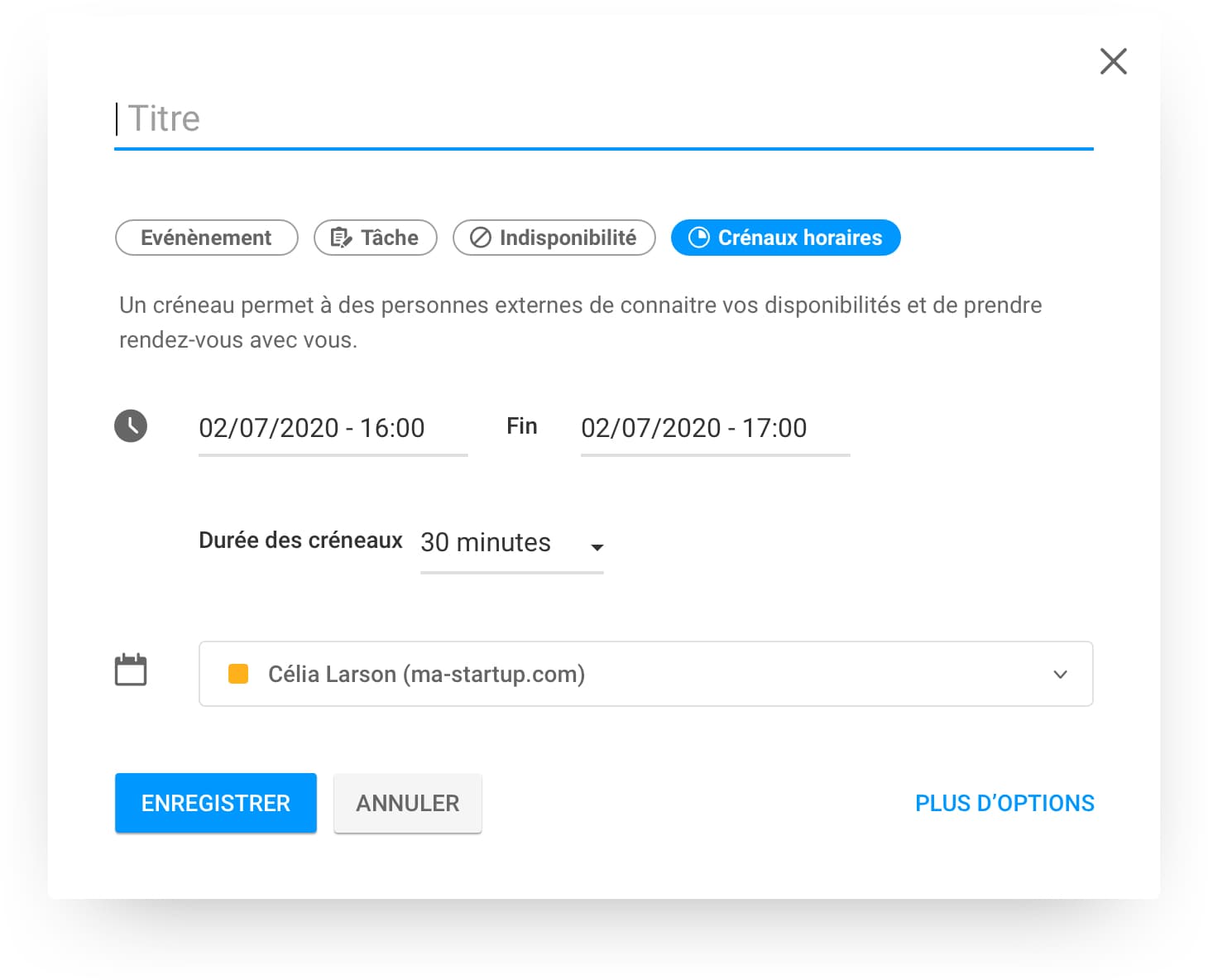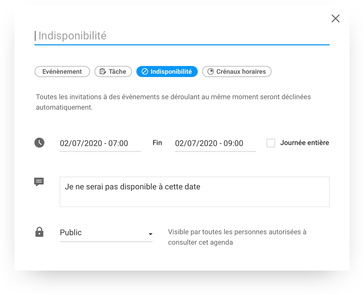 En plus des évènements classiques et des tâches, le calendrier propose désormais un évènement de type « indisponibilité » permettant de décliner automatiquement les invitations et un autre de type « créneaux horaires » permettant à des personnes externes de connaitre vos disponibilités et de prendre rendez-vous.