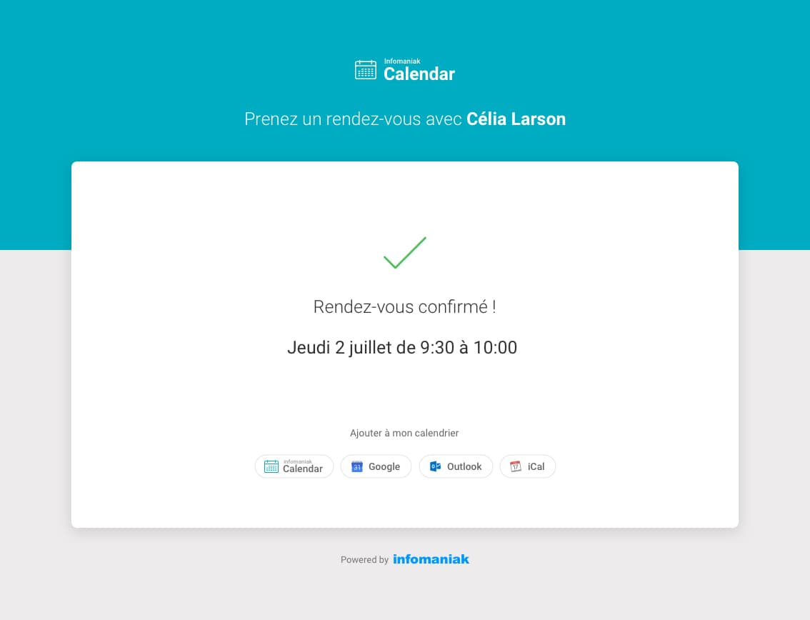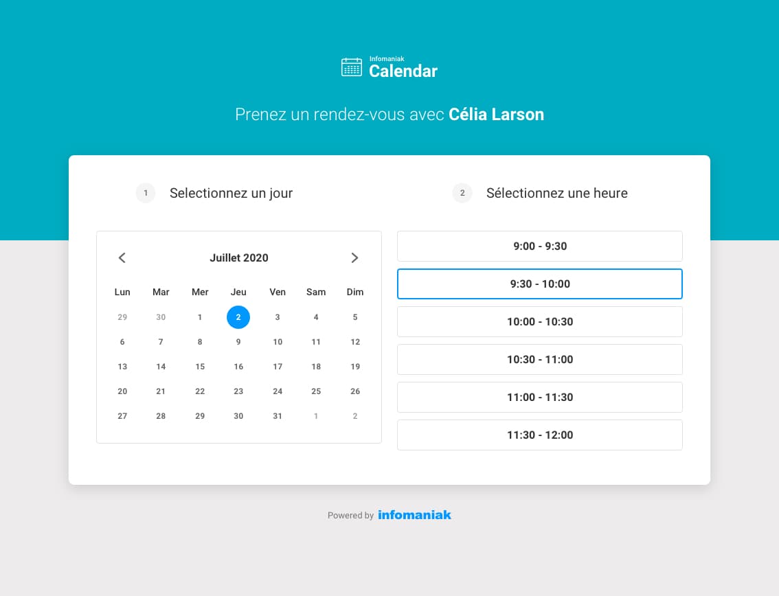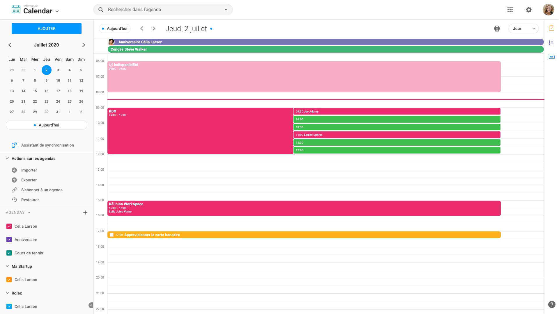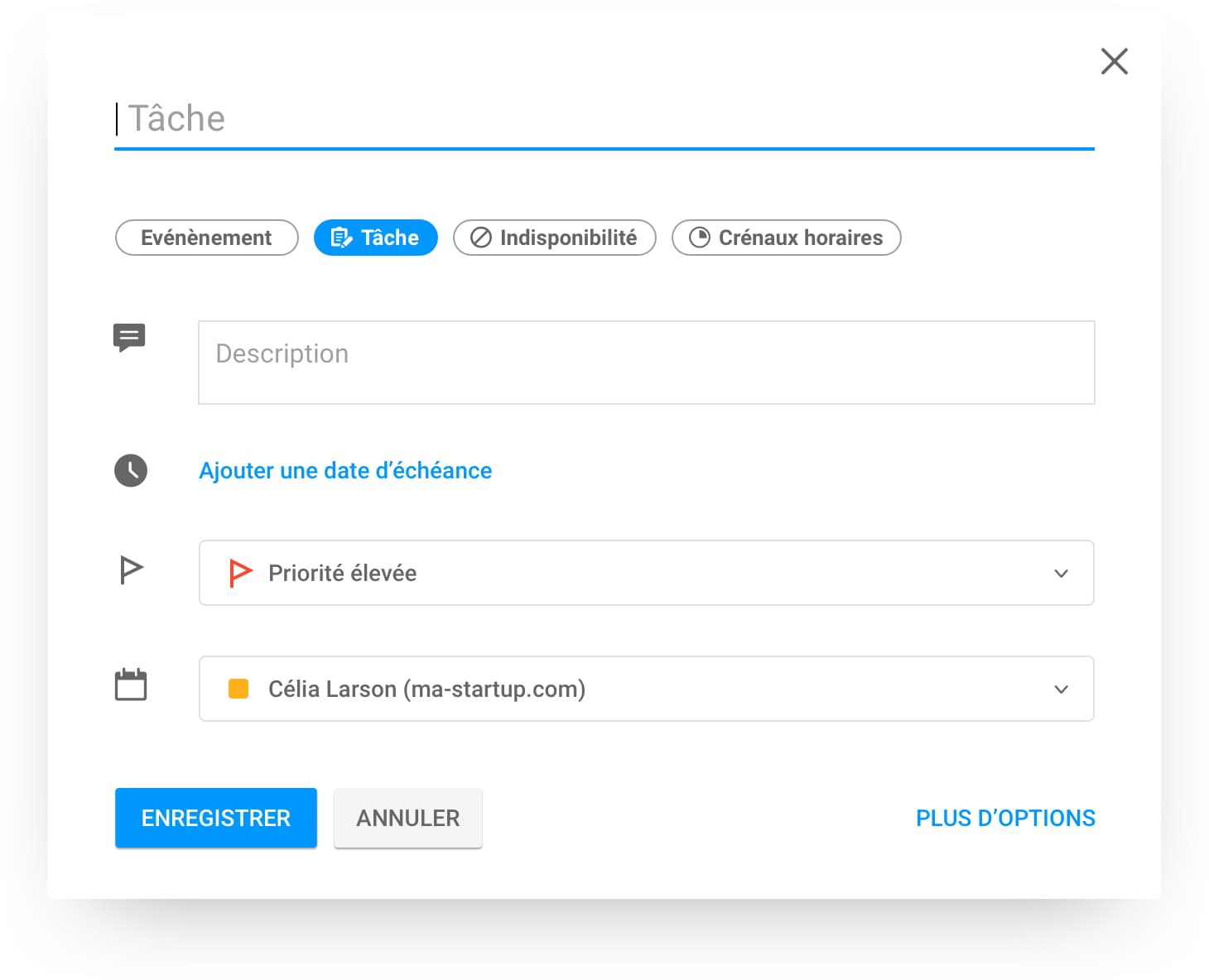 En plus des évènements classiques et des tâches, le calendrier propose désormais un évènement de type « indisponibilité » permettant de décliner automatiquement les invitations et un autre de type « créneaux horaires » permettant à des personnes externes de connaitre vos disponibilités et de prendre rendez-vous.