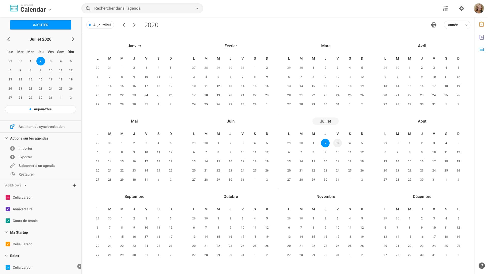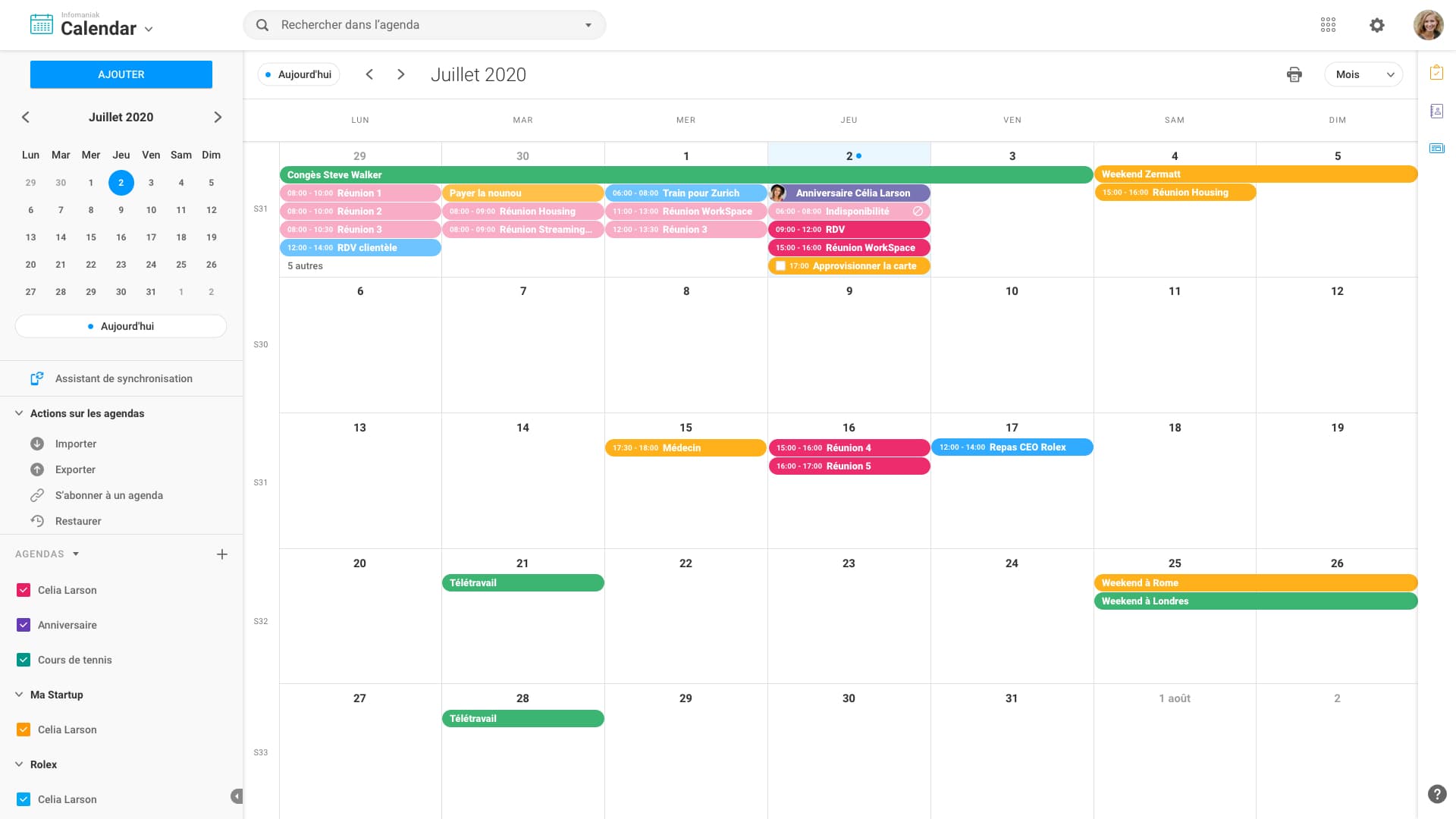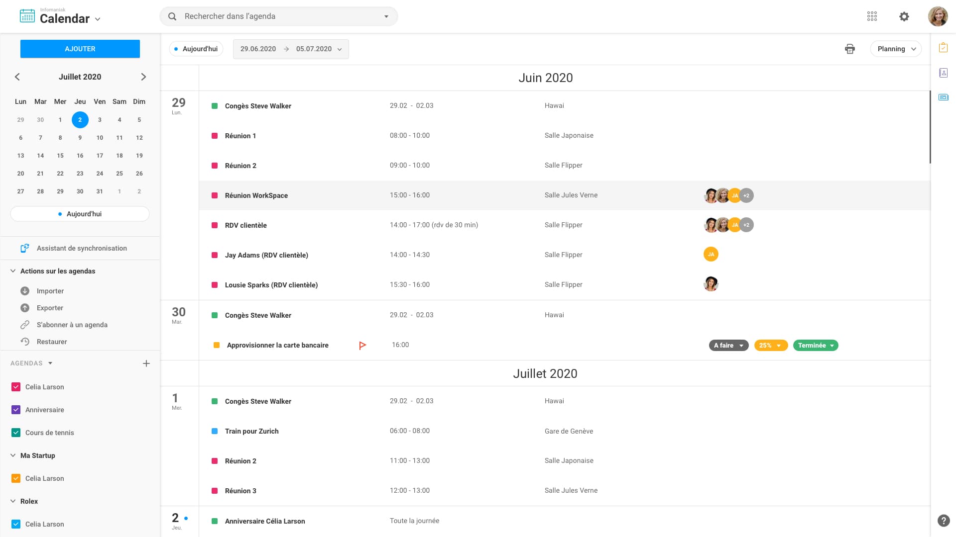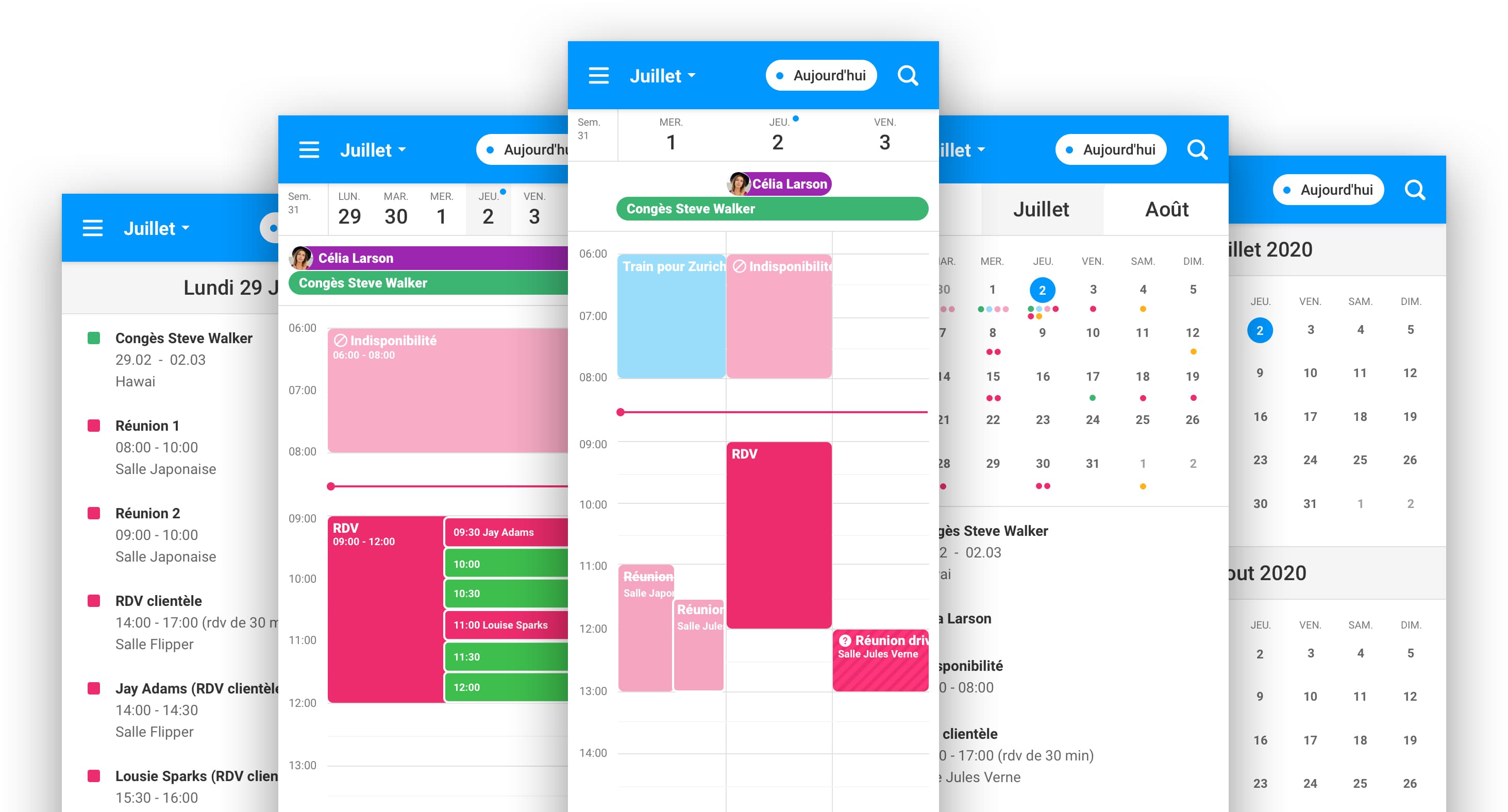 La gestion des contacts a permis de poser les bases (Layouts, navigation, composants, version mobile) et d'accélérer la conception. Cette nouvelle version de l'agenda intègre plusieurs modes d'affichage, de nouveaux types d'évènements, une recherche intelligente pour agender un évènement et la possibilité de réserver un créneau dans votre agenda par d'autres personnes.