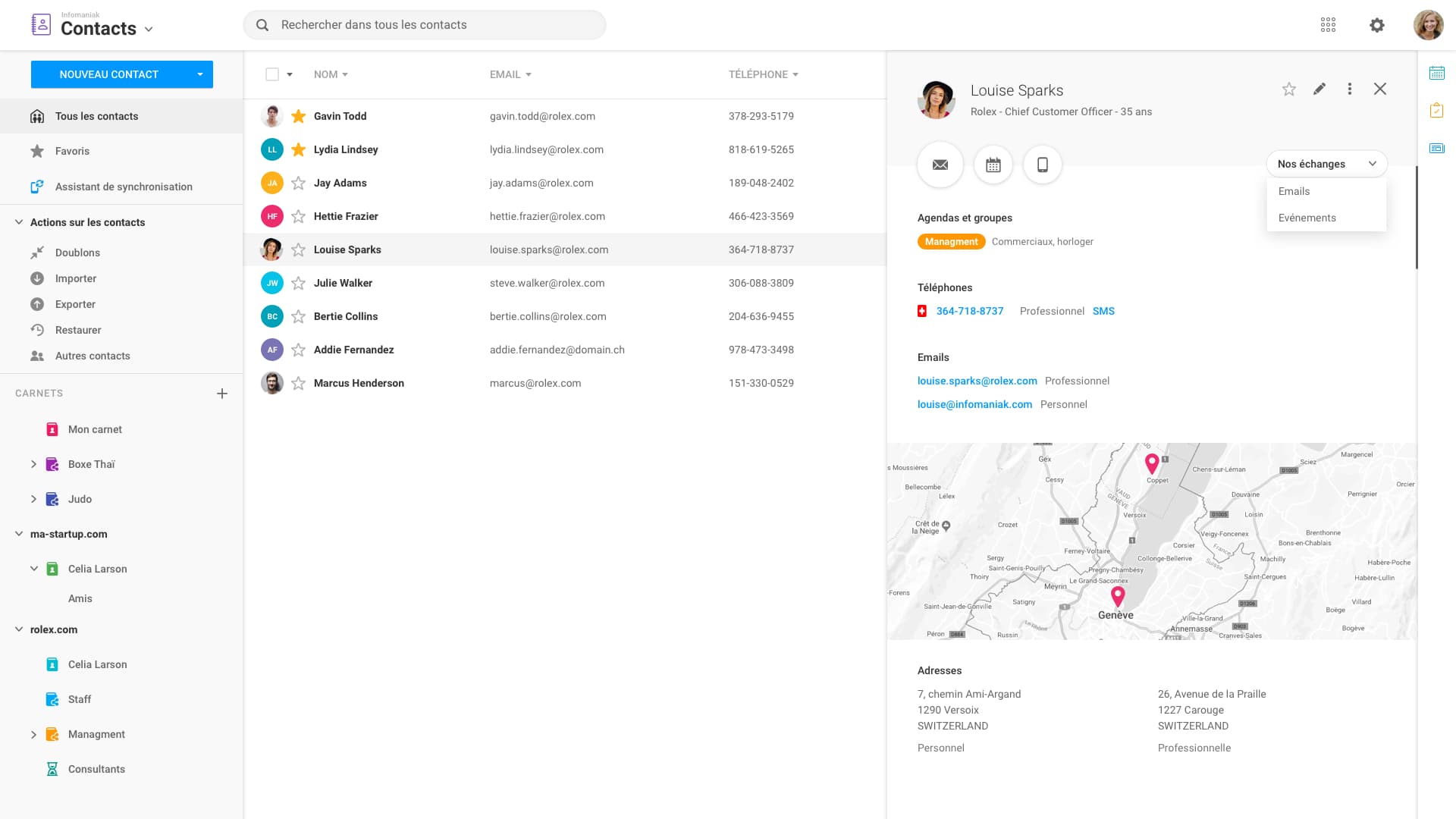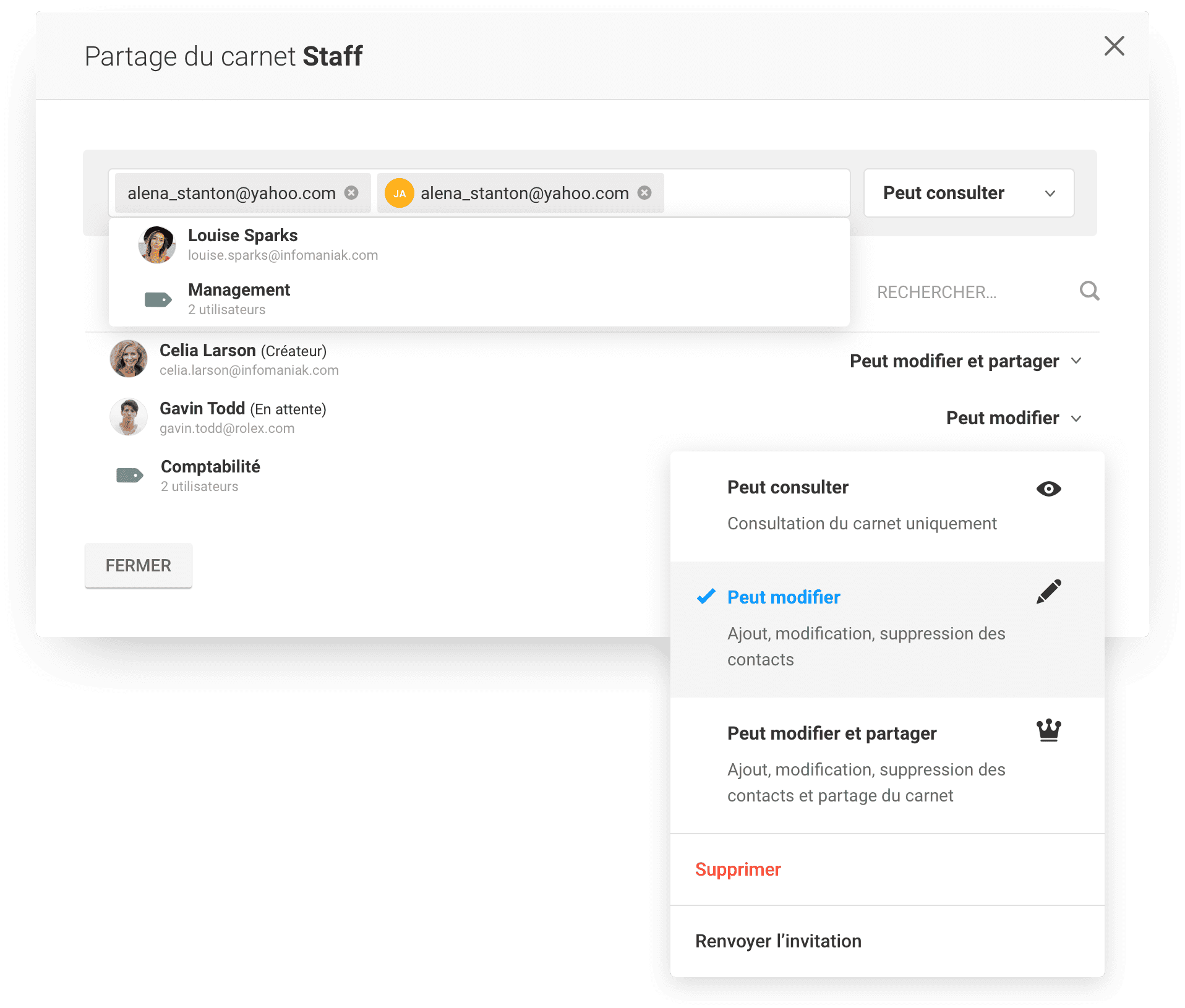 Cette nouvelle suite Infomaniak intègre de multiples partages (fichiers, contacts, calendriers…). Une réflexion a été menée pour unifier le processus de partage. Dans la gestion des contacts, vous pouvez partager un ou plusieurs carnets d’adresses avec différents utilisateurs, groupes d’utilisateurs et définir le rôle et les droits de chacun pour plus de sécurité.