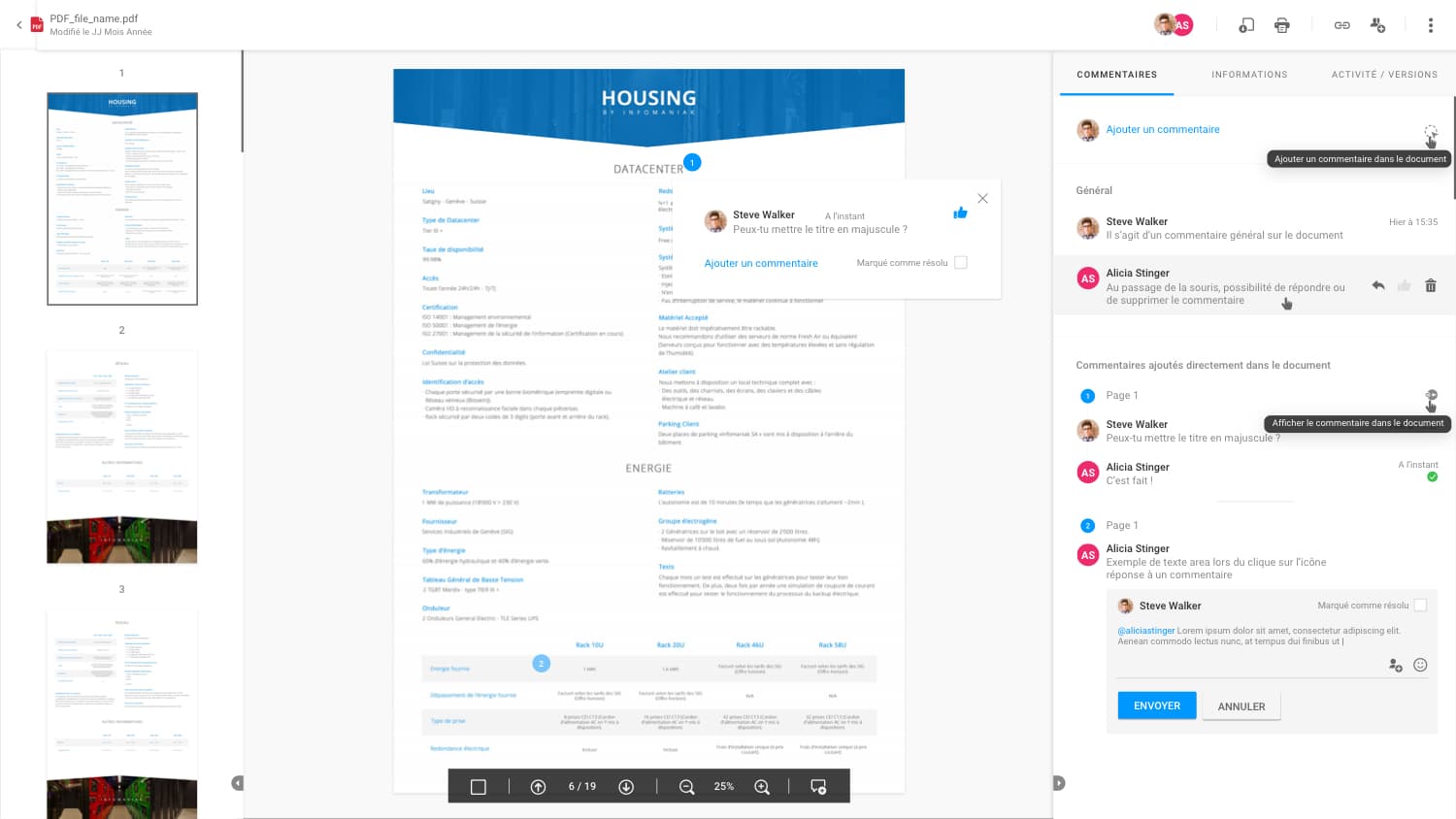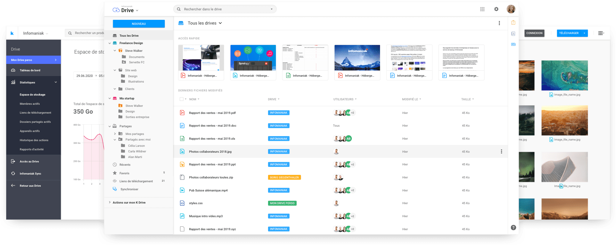 Nous nous efforçons de proposer plusieurs modes d’affichage à l’utilisateur. Dans le drive d’Infomaniak, il y aura donc un mode « liste » pour un affichage optimisé et un mode « miniatures » permettant de prévisualiser les médias et les documents.