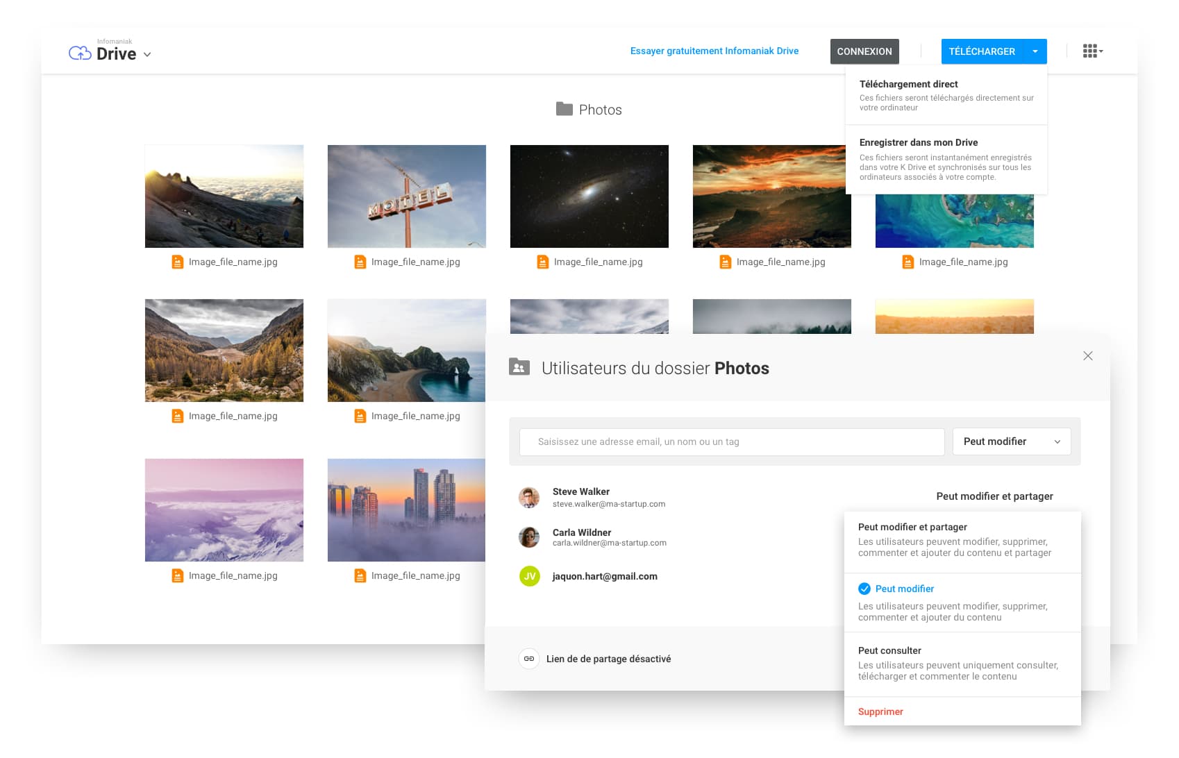 Le partage pourra se faire avec un ou plusieurs utilisateurs sur un fichier, un média, un dossier ou sous-dossier. Une notion de droits vient compléter le partage pour spécifier le rôle de chaque utilisateur ou groupe sur le fichier. Un lien public peut également être généré pour partager des documents avec des personnes n’ayant pas de compte Infomaniak.
