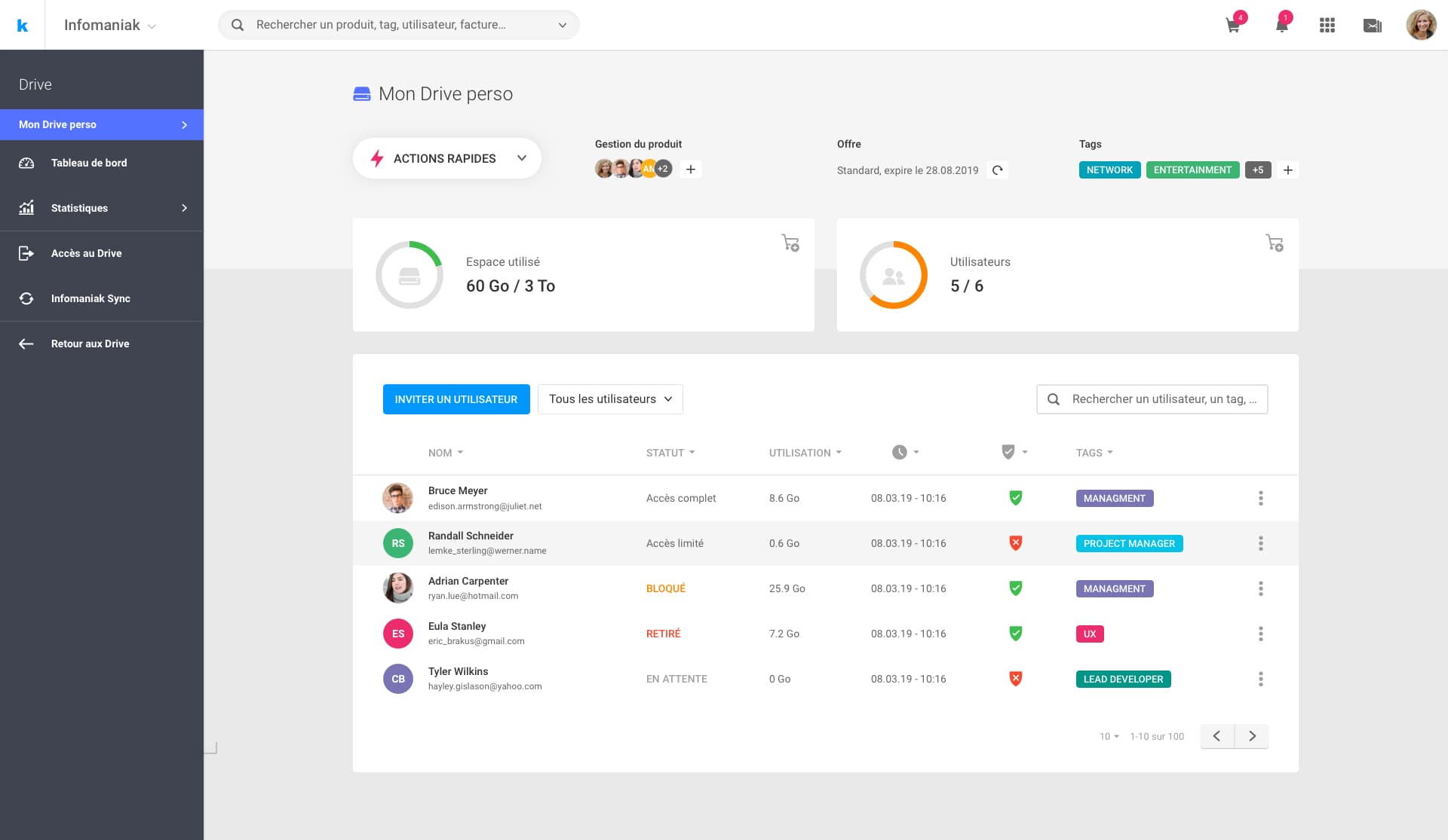 L’offre drive d’Infomaniak sera calculée au nombre d’utilisateurs actifs. Un critère de consommation sera proposé dans une offre de démarrage. Une gestion des utilisateurs et de leurs droits a été rajoutée dans le manager. En tant qu’administrateur, vous pourrez donc ajouter, supprimer et définir leur droits.