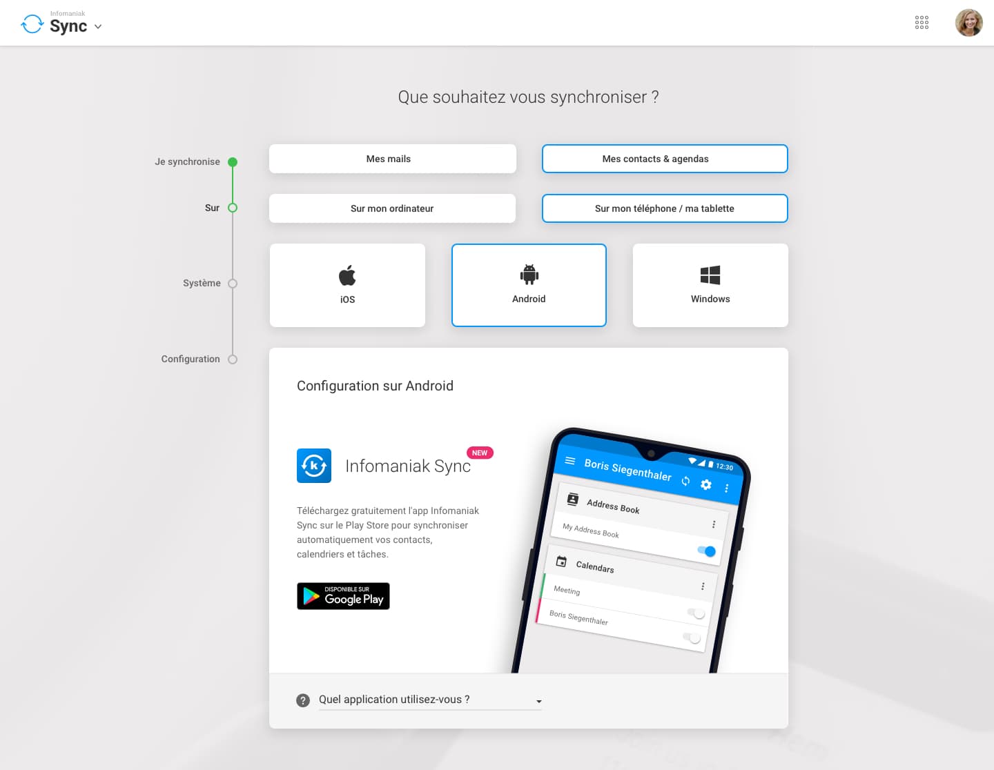 Un assistant simple et efficace a été pensé pour faciliter la synchronisation de vos contacts, agendas et le paramétrage de vos emails sur ordinateur, téléphone et tablette. Une application Android est également disponible sur Google Play pour les possesseurs de smartphones.